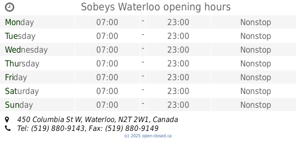 It is also possible to : Edit these OPENING HOURS of Store Sobeys In Waterloo, 450 Columbia St W,
