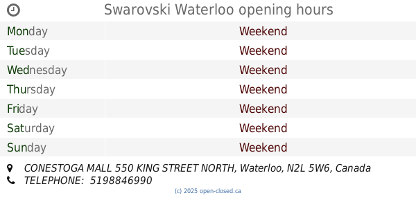 It is also possible to : Edit these OPENING HOURS of Store Swarovski In Waterloo, CONESTOGA MALL 550 KING STREET NORTH,